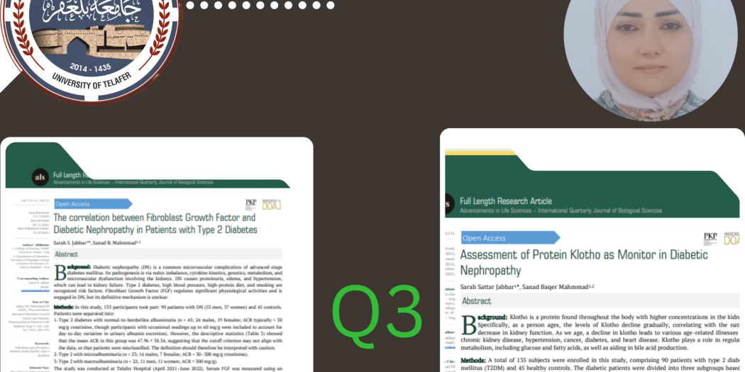 ” نشرُ بحثٍيين علميٍّين لتدريسية في جامعة تلعفر في مجلة عالمية ” في إنجازٍ علميٍّ جديدٍ يُضاف إلى سجل رئاسة جامعة تلعفر نشر المدرس الدكتور سارة ستار جبار بحثين علميين الاول بعنوان: The correlation between Fibroblast Growth Factor and Diabetic Nephropathy in Patients with Type 2 Diabetes والثاني بعنوان …