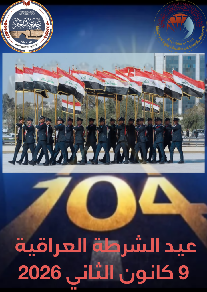 تتقدّم أسرة جامعة تلعفر بأصدق عبارات التهاني وأسمى آيات التبريك إلى الشرطة العراقية الباسلة بجميع صنوفها، بمناسبة عيد الشرطة العراقية ومرور الذكرى الرابعة بعد المئة لتأسيسها، هذه المناسبة الوطنية العزيزة التي تمثّل سجلًا حافلًا بالمواقف البطولية والتضحيات الجسام في سبيل أمن الوطن واستقراره.