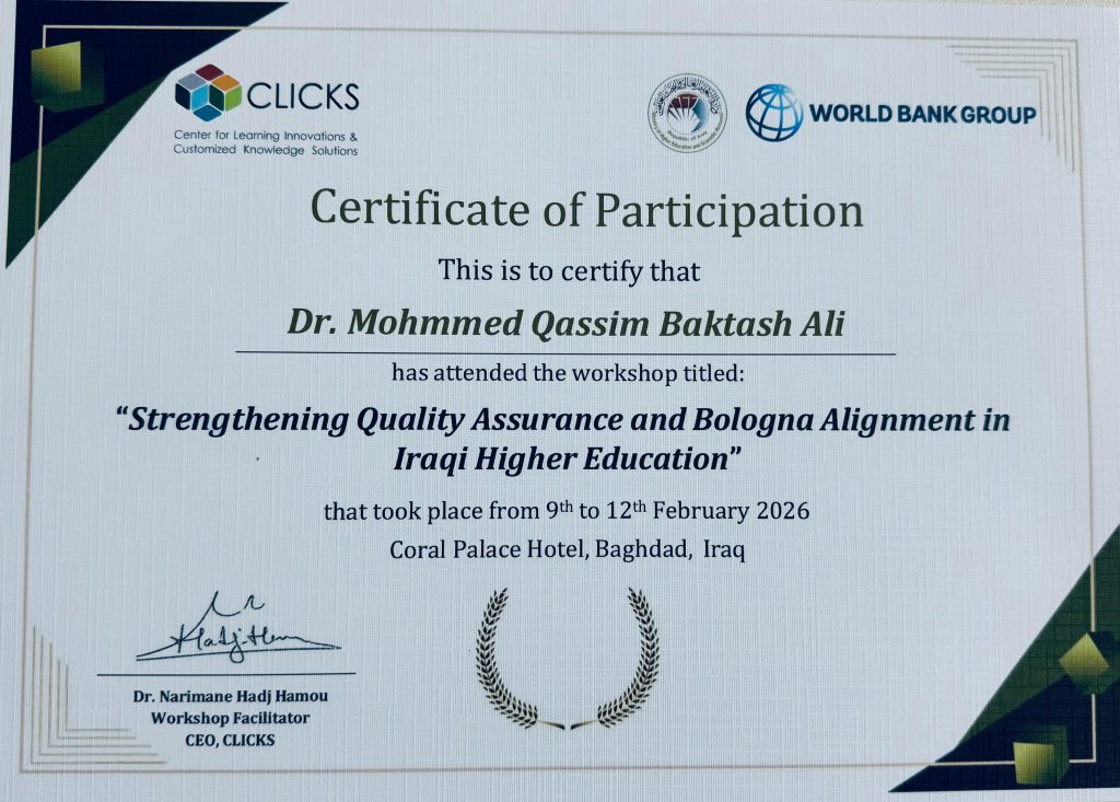 برعاية الأستاذ الدكتور عقيل يحيى هاشم الأعرجي، رئيس جامعة تلعفر، شارك الأستاذ المساعد الدكتور محمد قاسم بكتاش، مسؤول قسم ضمان الجودة والأداء الجامعي، في الدورة التدريبية الموسومة «خطة تنفيذ القدرات في مجال ضمان الجودة وعملية بولونيا والكفاءة الخارجية».