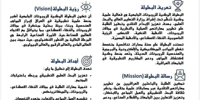 تعلن جامعة تلعفر عن فتح باب المشاركة أمام جميع طلبتها في مختلف الكليات والأقسام للاشتراك في البطولة الوطنية الجامعية للروبوتات وتطبيقات الذكاء الاصطناعي (NURAI 2026)، التي تُعد منصة وطنية رائدة لدعم الطاقات الشبابية وتحويل الأفكار الإبداعية إلى مشاريع تطبيقية توظّف تقنيات الروبوتات والذكاء الاصطناعي في خدمة المجتمع العراقي.