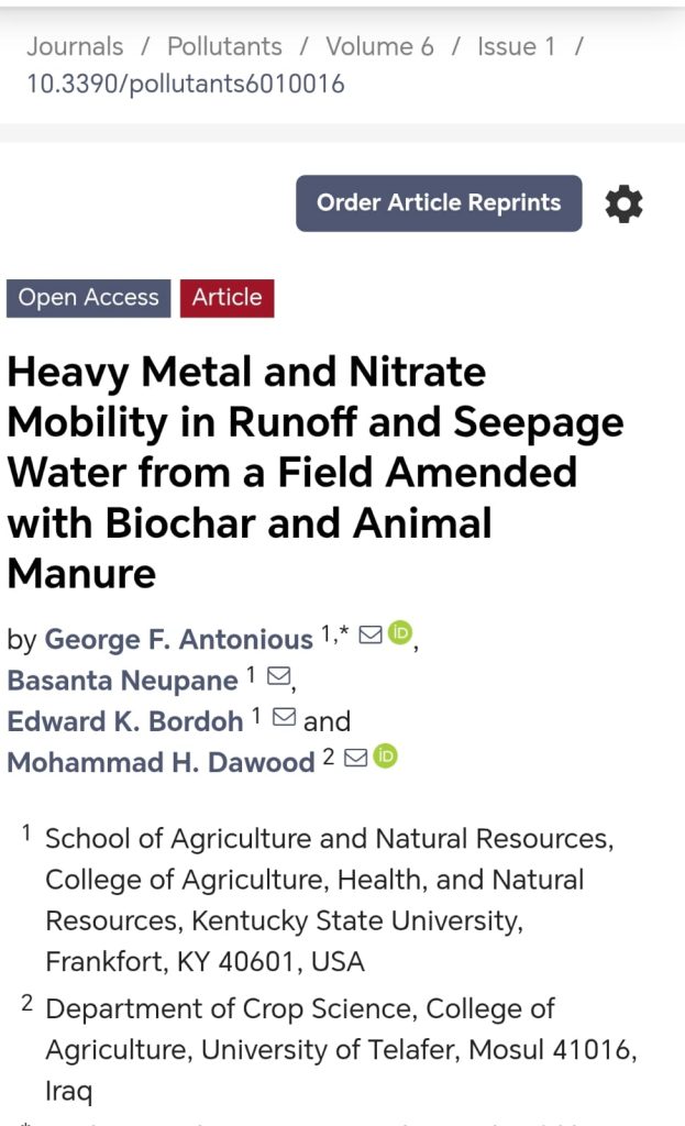 وتناول البحث مشكلة ثبات المعادن الثقيلة (Heavy Metals) وتأثيرها على جودة البيئة (Environmental Quality) وصحة الإنسان. أُجريت تجربة حقلية في حقل البطاطا (Potato Field) لتقييم أثر إضافة الفحم الحيوي (Biochar) أو الأسمدة الحيوانية (Animal Manure) في حركة النترات (Nitrate) والمعادن السامة نحو مياه الجريان السطحي (Runoff Water) ومياه الرشح (Seepage/Infiltration Water).