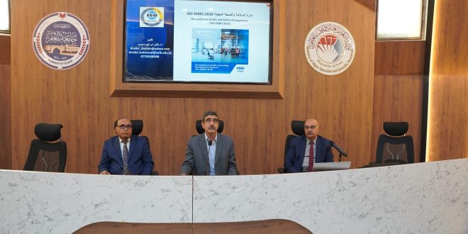 Under the patronage of the President of the University of Telafer, Prof. Dr. Abdulaziz Ahmed Aziz, and in the presence of the Assistant President for Administrative Affairs, Prof. Dr. Huda Ismail Khalid, along with the deans of colleges, their assistants, heads of scientific departments, and university staff, as well as quality assurance officers from the districts of Telafer, the workshop entitled “Occupational Health and Safety Management ISO 45001:2018” was launched on Tuesday, November 4, 2025, at the Martyrs of Telafer Hall.
