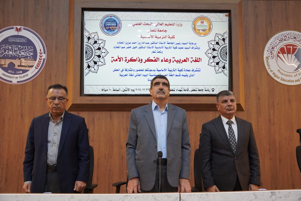 Under his patronage and with his direct attendance, the President of Telafer University, Professor Dr. Abdul Aziz Ahmed Aziz, participated in the celebration organized by the College of Basic Education on the occasion of the World Arabic Language Day, which is observed on 18 December each year. The event was held on Monday, 22 December 2025, at the Martyrs of Telafer Hall, under the theme “The Arabic Language: A Vessel of Thought and the Memory of the Nation.”